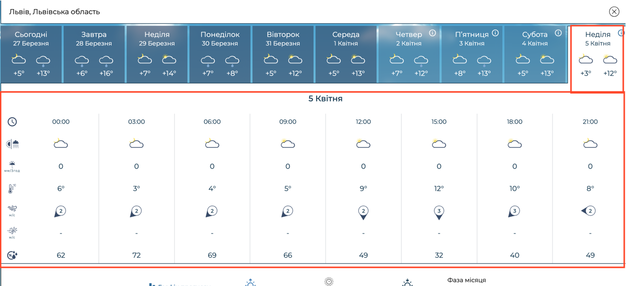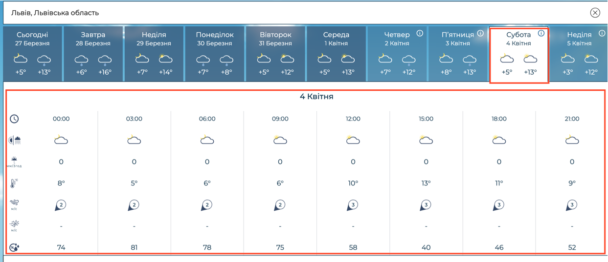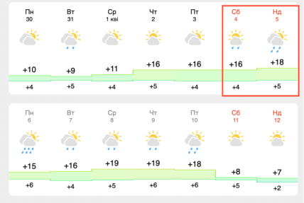 За даними державних метеорологів, температура повітря буде дещо скромнішою порівняно з приватними сервісами, але цілком комфортною для початку квітня. У суботу, 4 квітня, очікується мінлива хмарність із проясненнями; вдень термометри покажуть близько +13°C, а вночі — до +5°C. У неділю, 5 квітня, також буде сухо: вдень повітря прогріється до +12°C, проте ніч та ранок будуть прохолоднішими — близько +3°C.