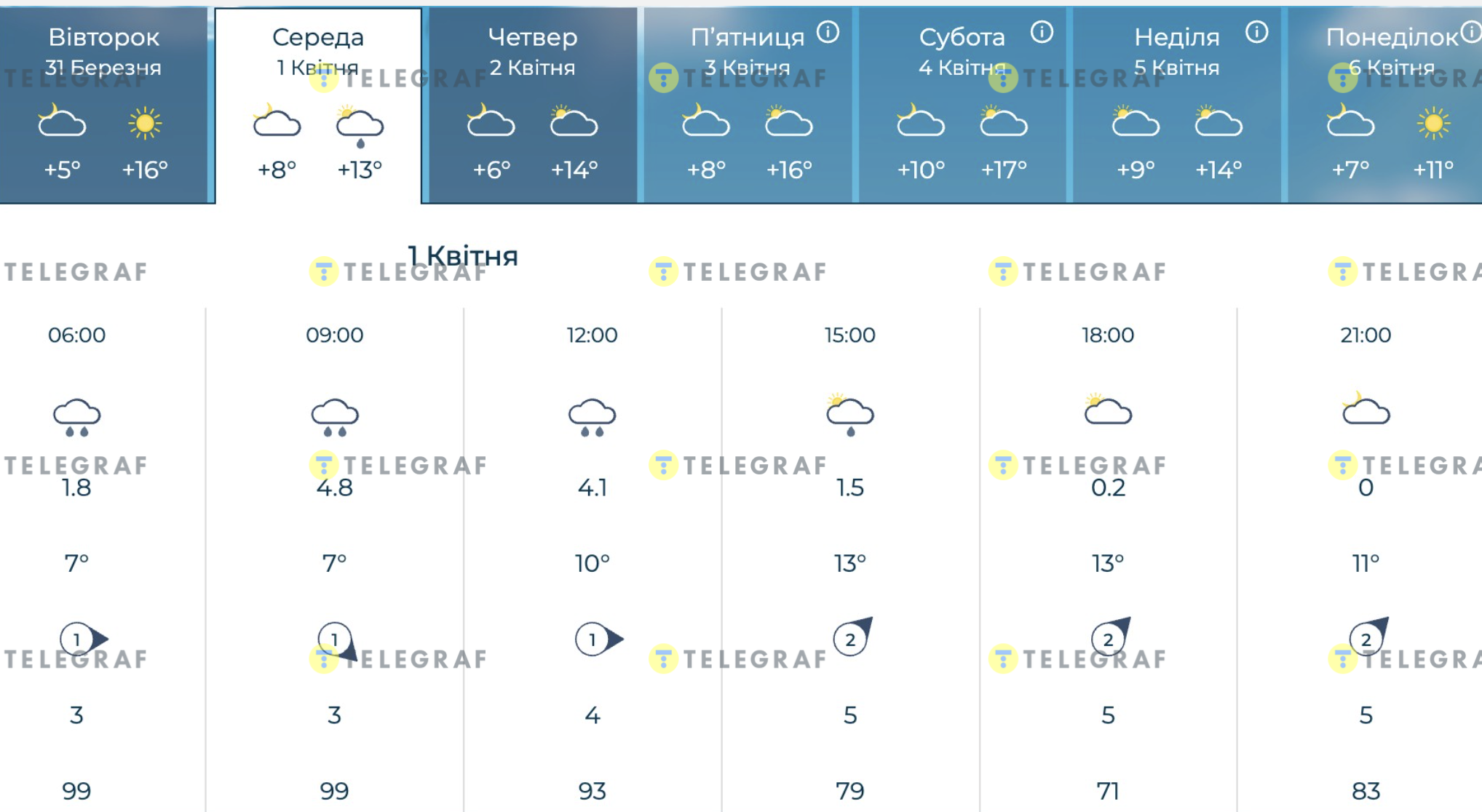 За даними Укргідрометцентру, з 1 квітня Україну чекає досить тепла, але хмарна погода. Так, стовпчик термометра показуватиме від +6 до +16 градусів вдень та до +9 градусів вночі. На заході України можливий невеличкий дощ. Найтеплішими днями синоптики називають 3 та 4 квітня, адже тоді температура повітря сягне позначки в +18 градусів.
