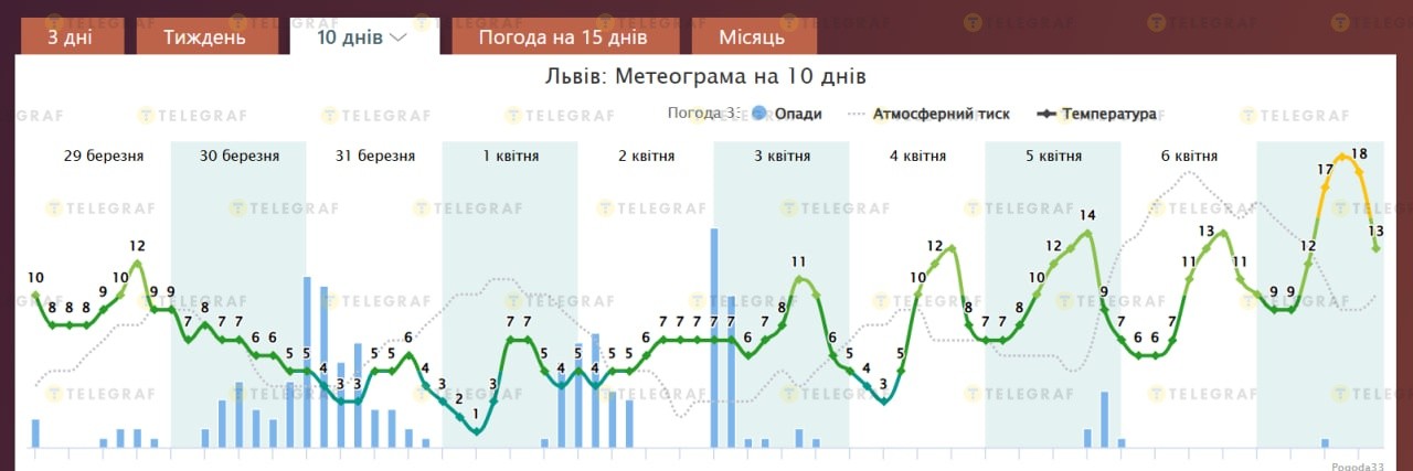 Пік потепління очікується 7 квітня, коли у Львові можливе підвищення температури до +17…+18 градусів, що є аномально високим показником для цього періоду. Опади поступово припиняться.