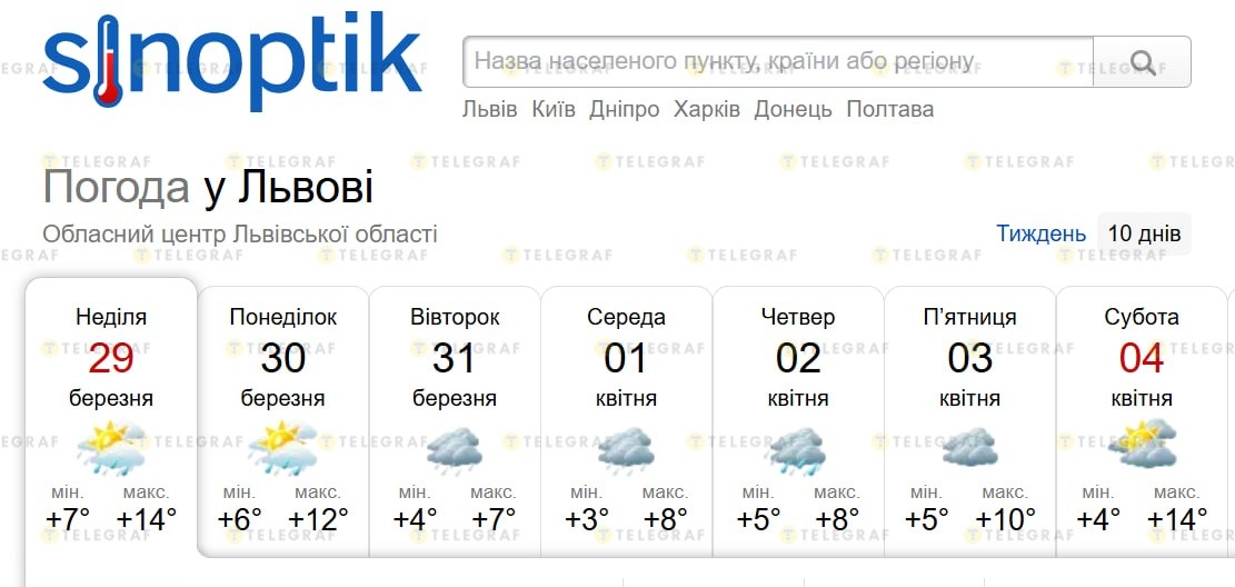 У ресурсі "Sinoptik" також прогнозують похолодання упродовж 31 березня-2 квітня, коли температура вдень знизиться до +7…+8 градусів, а вночі +3…+5 градусів. Разом з тим очікується період дощів. З п'ятниці, 3 квітня, показники на термометрах поступово підвищуватимуться.