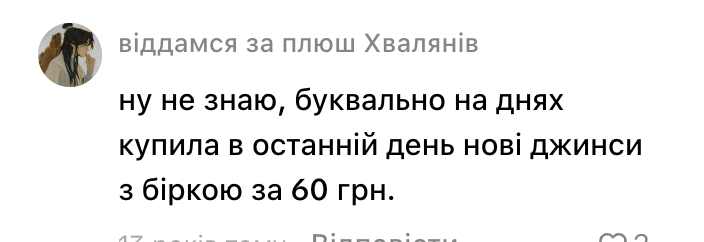 - Ну не знаю, буквально на днях купила в останній день нові джинси з біркою за 60 грн.