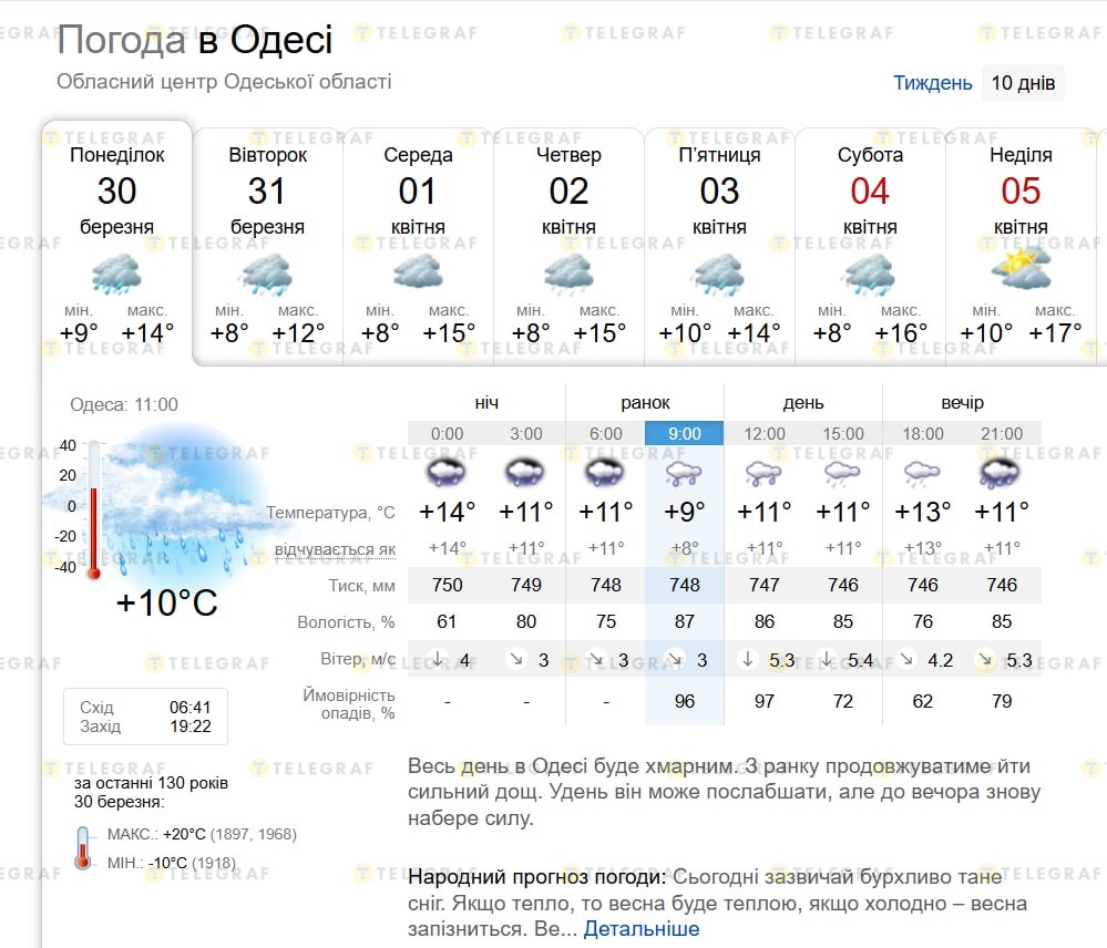 Початок періоду буде досить похмурим і вологим. У понеділок і вівторок, 30-31 березня очікуються дощі, буде прохолодно, але температура вдень сягатиме +12…14 градусів. У середу, 1 квітня, опади візьмуть перерву, проте погода стане теплішою — до +15 градусів. У цей період вночі показники не опустяться нижче +8 градусів.