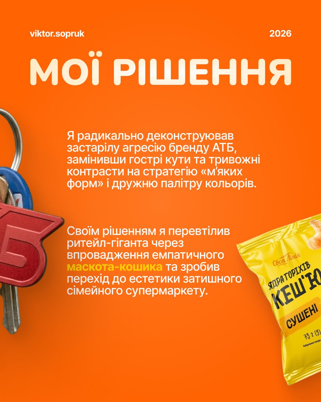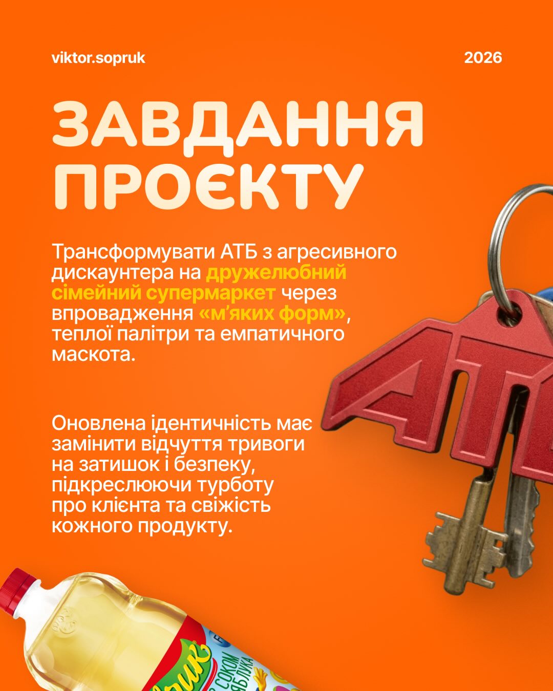 Українець розробив та презентував проєкт візуальної трансформації мережі супермаркетів "АТБ", запропонувавши повністю відмовитися від традиційної сіро-синьої палітри на користь "теплих" кольорів. За його словами, основна ідея концепту полягає у перетворенні бренду з жорсткого дисконтера на дружелюбний сімейний магазин за допомогою м’яких форм та оновленої стратегії комунікації.