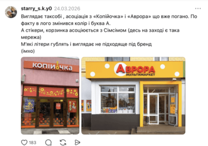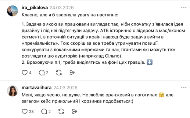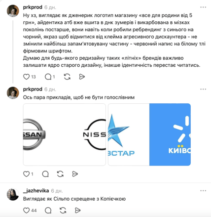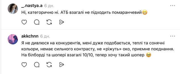 Водночас багато хто розкритикував запропонований дизайн через втрату впізнаваності. Люди зауважують, що помаранчева гама надто нагадує візуальний стиль конкурентів, таких як "Сільпо", "Аврора" чи "Копійочка". Також лунають думки, що нинішня айдентика АТБ вже стала частиною культурного коду, тому радикальна зміна кольорів і шрифтів може позбавити мережу її унікального характеру та зробити маркет схожим на звичайний магазин формату "все від 5 гривень".