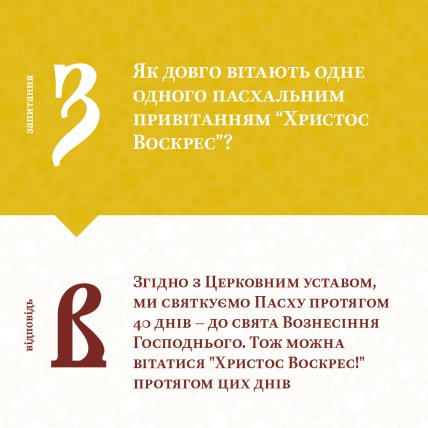 "Протягом сорока днів ми вітаємо один одного пасхальним вітанням: "Христос Воскрес!" – і відповідаємо: "Воістину Воскрес!". Вперше це привітання звучить у Великдень на початку пасхальної раннньої, далі священнослужителі вітають один одного. Також впродовж канону на ранній священники звершують кадіння і виходячи на солею (підвищену частину підлоги перед іконостасом), вітаються до вірних "Христос Воскрес!" – йдеться у повідомленні.