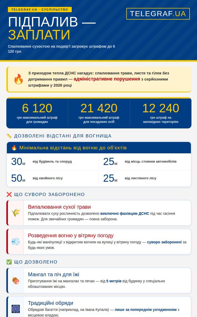 З приходом тепла в Україні частішають випадки пожеж через необережність під час спалювання сухої рослинності та гілок. Порушення правил пожежної безпеки тягне за собою серйозну відповідальність і великі грошові стягнення.