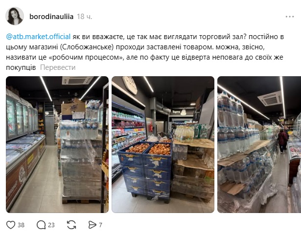 Про черговий такий випадок повідомила користувачка Threads. Вона поставила питання офіційному акаунту "АТБ" про те, чому в одному з магазинів їхньої мережі "зал заставлений товаром".