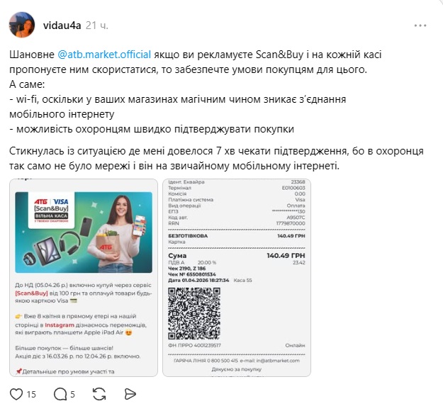 За словами авторки посту в Threads, під час використання програми спливає кілька "підводних каменів", які заважають повноцінно використовувати сервіс. Річ у тому, що в магазинах "АТБ" відсутній Wi-Fi, а мобільний зв’язок іноді може пропадати всередині будівлі. Це означає, що зробити покупку стає неможливо або дуже проблематично (якщо мережа слабка).