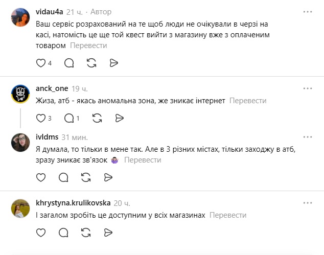 • "Ваш сервіс розрахований на те, щоб люди не чекали у черзі на касі, але це ще той квест вийти з магазину вже з оплаченим товаром".