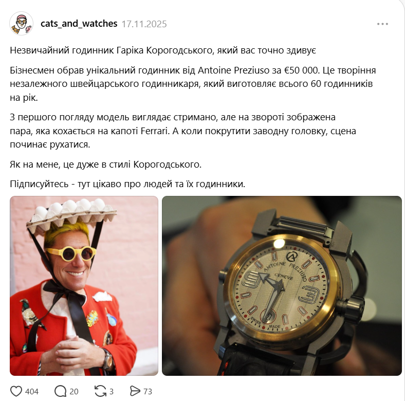 Користувач соцмережі Threads під ніком "cats_and_watches" помітив на фото Корогодського незвичайний годинник, про який вирішив зробити пост. Виявилося, бізнесмен навіть в аксесуарах віддає перевагу екстравагантному стилю.