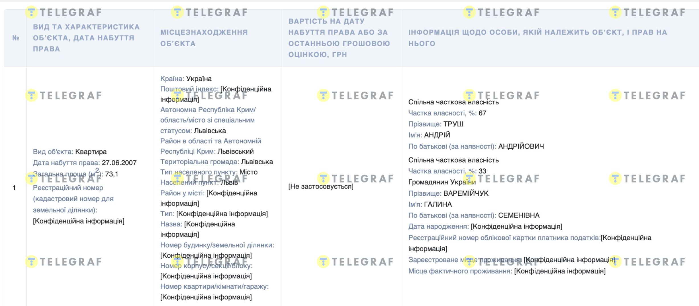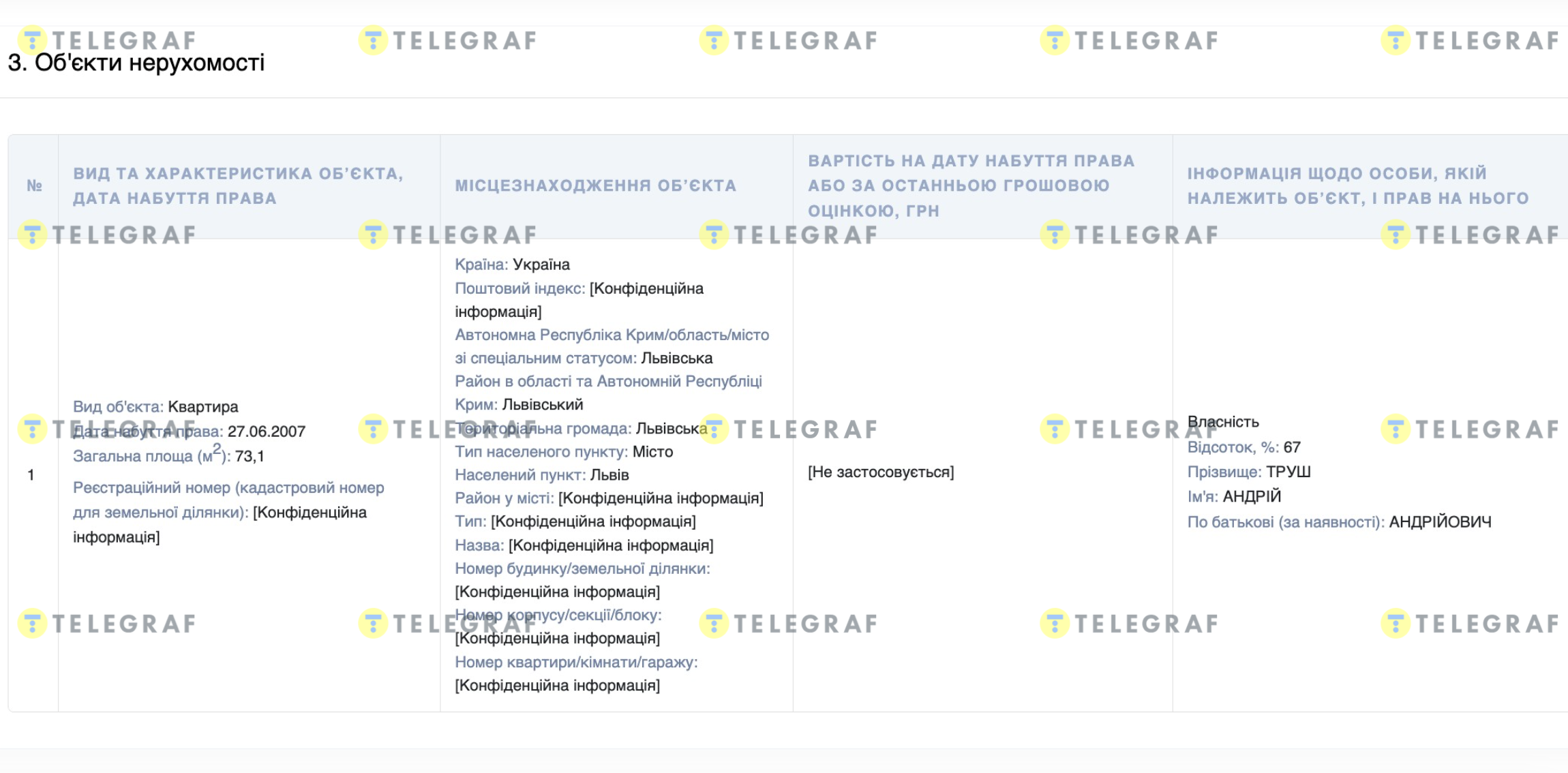 При цьому він має у власності квартиру у Львові на 73,1 кв. м. До слова, у попередні роки в деклараціях вказувалось, що Труш має лише 67% власності житла, а кому належать інші відсотки було невідомо. Однак у 2025 виявилось, що йдеться про Варемійчук Галину Семенівну. Тут одразу виникає питання, як жінка пов'язана з митником. Можливо, це його родичка, подруга чи супутниця.