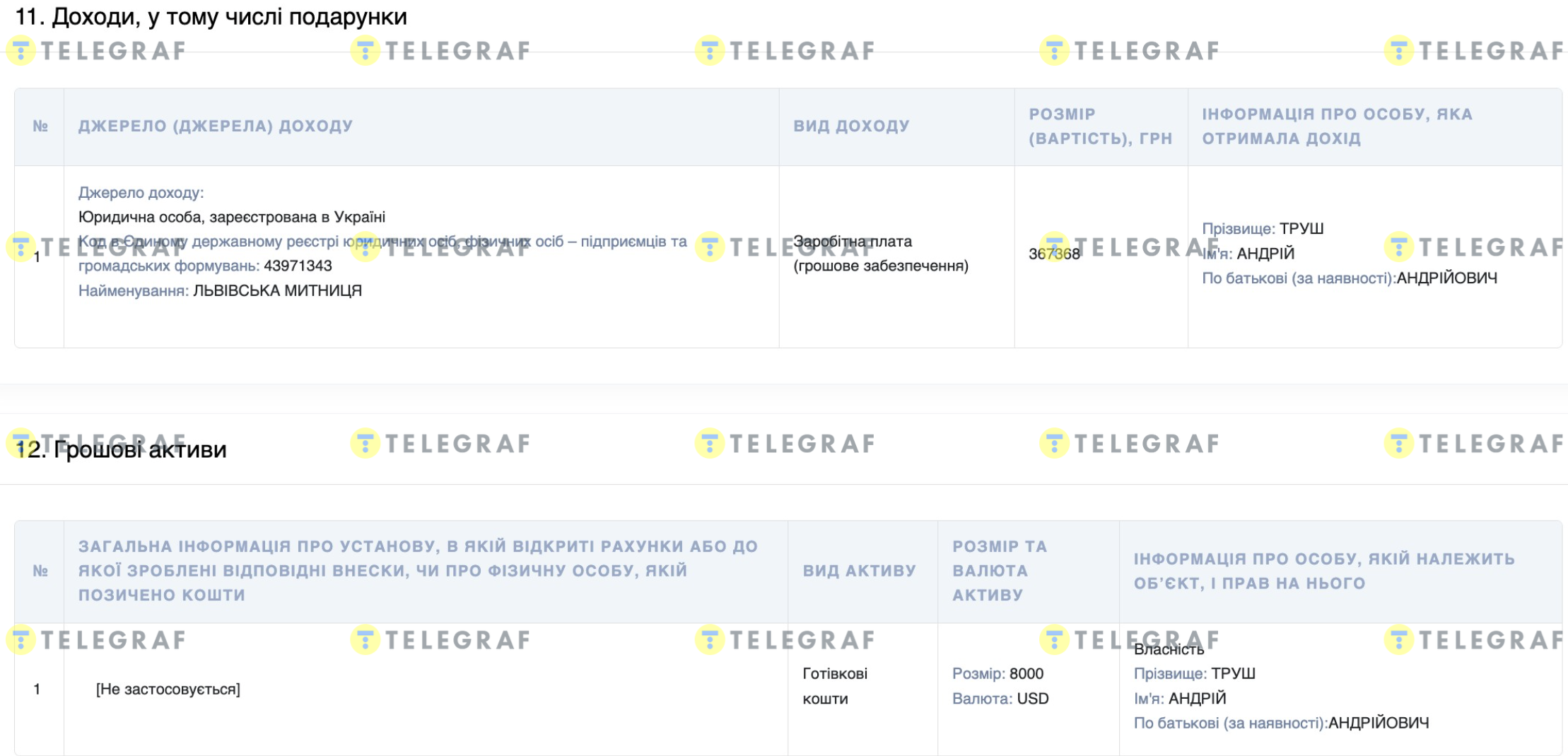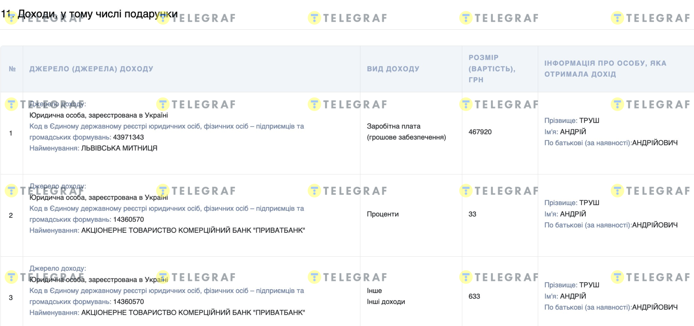 "Телеграф" вже знайшов, вірогідно, його декларацію про доходи та проаналізував. За даними документа, у 2025 році львів'янин на ім'я Андрій Труш, який отримує заробітну плату на Львівській митниці, заробив 467 920 грн, тобто по 38,9 тисяч на місяць.