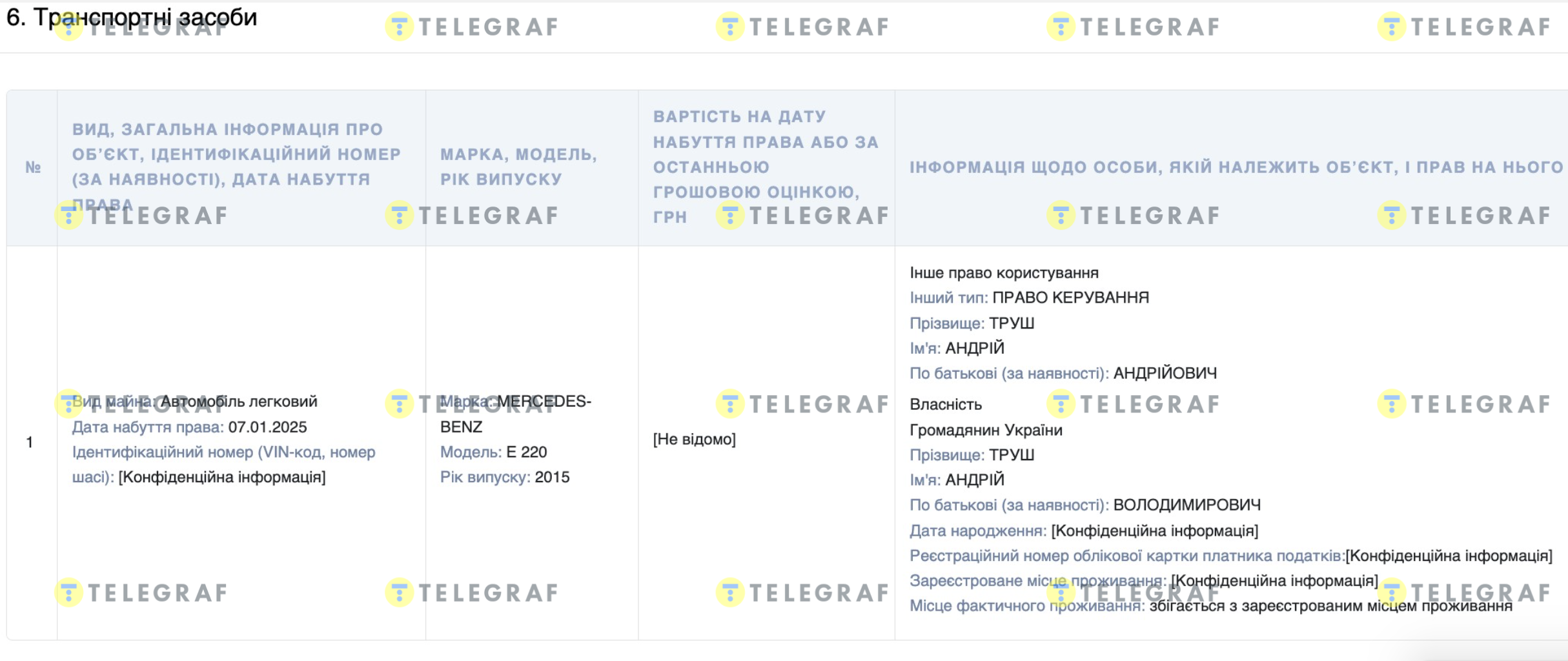 Втім цікаво й те, що у січні 2025 Труш задекларував авто MERCEDES-BENZ E 220 2015 року випуску. Власником авто є Труш Андрій Володимирович — ймовірно, батько Андрія Андрійовича. Водночас сам митник має право користування цією машиною. До слова, на ринку вживаних авто такий транспорт коштує від 15 до понад 23 тисяч доларів. Походження грошей на покупку невідоме.