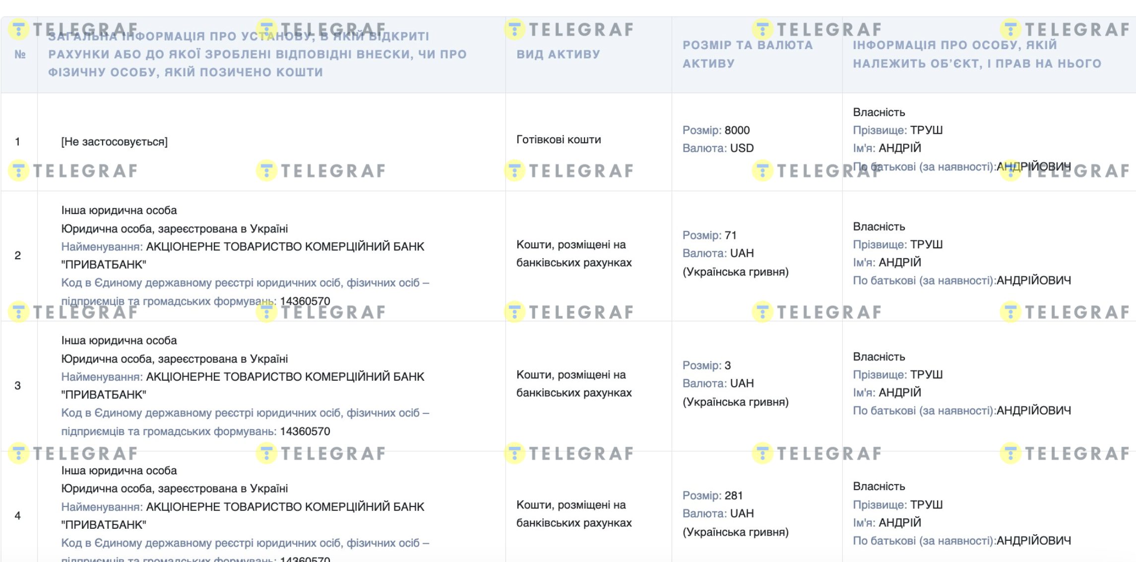 Цікаво, що попри такий заробіток, заощаджені кошти митник не витратив та навпаки трохи поповнив свою скарбницю. У 2025-2024 він мав готівкою 8 тисяч доларів, а у 2023 — 7200. При цьому банківські рахунки Труша майже порожні, дорогих покупок не вказано. Також відсутні дані про сімʼю.