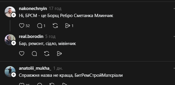 Обговорення розгорілися у соціальній мережі Threads та швидко стали приводом для гумору. У цьому матеріалі "Телеграф" розповідає, чи перекладається абревіатура "БРСМ" і розповідає про варіанти, які пропонують.