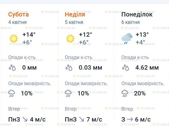 У неділю, 5 квітня, утримається схожа ситуація — без опадів і з мінливою хмарністю. Вночі та вранці прогнозують близько +8 С°, вдень — до +14 С°, увечері — до +10 С°. Вітер місцями посилюватиметься до 10 м/с.