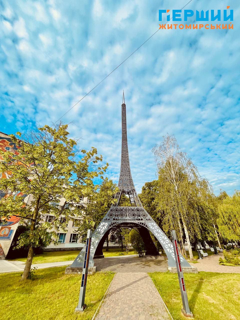 Дуже цікаву копію Ейфелевої вежі висотою у понад 25 (як 9-поверхівка) метрів встановили у Житомирі у 2020 році біля ДУ "Житомирська політехніка". Як розповів "Перший житомирський інформаційний портал", конструкцію прикрашено орнаментами, які створюють ефект вишиванки. Вийшла французька красуня з українською душею.