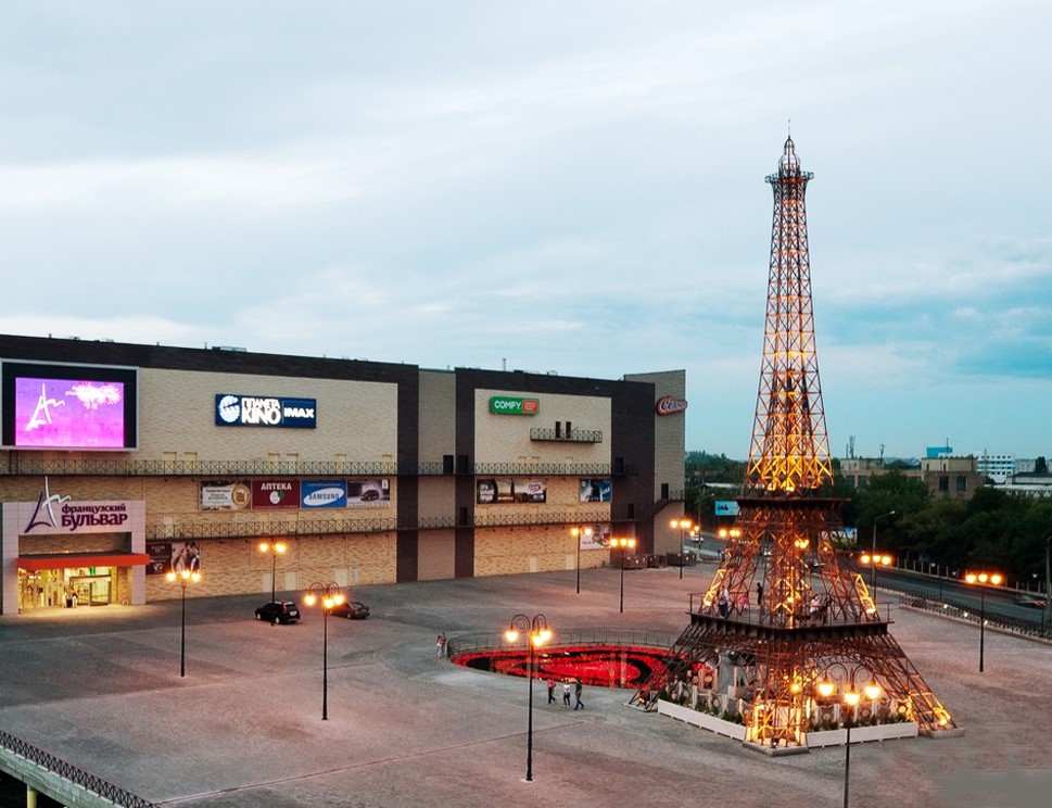 Зменшена копія Ейфелевої вежі з'явилася в обласному центрі ще у 2012 році. Вона є частиною комплексу будівель торгово-розважального центру "Французький бульвар" на перетині вулиці Академіка Павлова та Салтівського шосе.