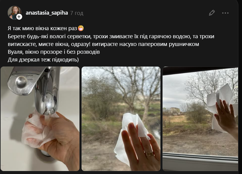 Мити вікна — справа енерговитратна, особливо коли після всіх зусиль на склі залишаються розводи. Проте українка Анастасія Сапіга знайшла спосіб, який потребує мінімум інструментів: лише пачку вологих серветок та рулон паперових рушників.
