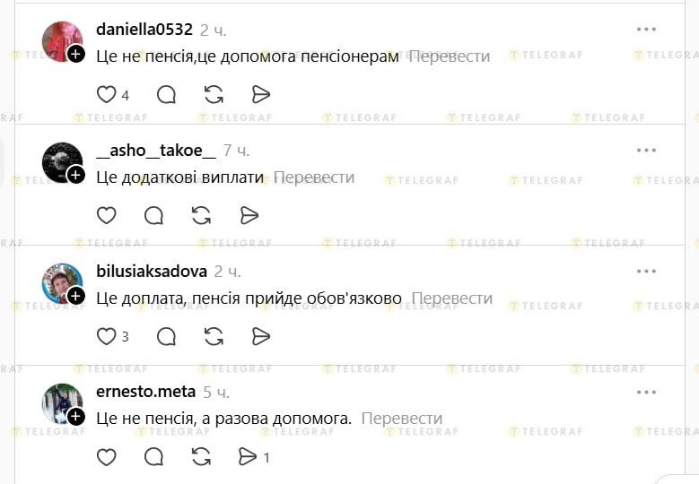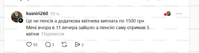 У соцмережі "Threads" одна з українок розповіла, що отримала виплату з позначкою "пенсія" у розмірі 1500 гривень, хоча очікувала іншу суму. Її допис викликав активне обговорення: у коментарях дехто з користувачів також написали, що отримали аналогічні нарахування.
