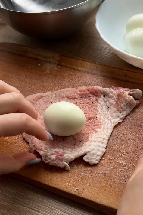 3. Викладіть варені очищені яйця на підготовлене м’ясо та щільно загорніть у рулет. Зафіксуйте рулет кулінарною ниткою, щоб він тримав форму під час приготування.