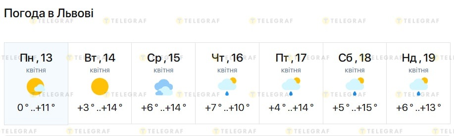 У понеділок, 13 квітня, у місті буде прохолодно — близько +11 С° вдень і до 0 С° вночі, опадів не прогнозують. Наступного дня, 14 квітня, стане тепліше — до +14 С°, день буде переважно сонячним.