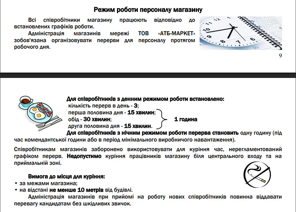 Режим роботи персоналу магазинів "АТБ" опубліковано на сайті мережі. Зазначається, що співробітники працюють відповідно до встановлених графіків роботи. Адміністрація магазинів зобов'язана організовувати перерви для персоналу.