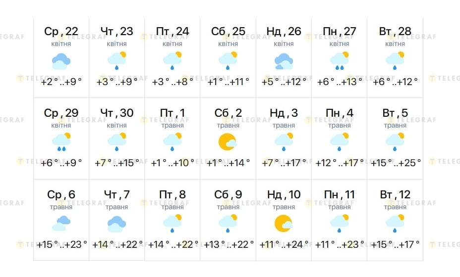 Перші "літні" дні на початку травня, швидше за все, не будуть короткочасними. З середи, 6 травня, і до вівторка, 12 травня, у місті затримається літнє тепло — до +24 вдень та +15 градусів вночі. Однак місцями все ще дощитиме.