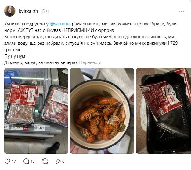 Про це повідомляють у соціальній мережі Threads. За словами клієнтки, йдеться про упаковку варено-морожених раків одного із виробників. Покупниця стверджує, що, незважаючи на цінник у 729 гривень, товар нібито виявився неналежної якості.