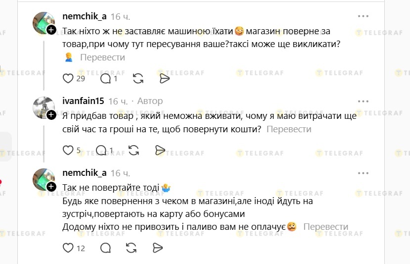 У коментарях до допису користувач зазначив, що за стандартною процедурою повернення відшкодовуються лише кошти за товар неналежної якості, тоді як транспортні витрати не компенсуються.