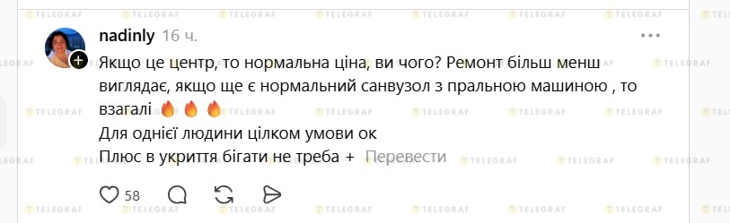 У соцмережах пропозиція викликала жваве обговорення. Дехто з користувачів навіть знайшов у ній плюси. Зокрема, зазначають, що для центру це нормальна ціна, а також жартують, що з такого житла не потрібно спускатися в укриття під час тривог — воно вже фактично знаходиться під землею.