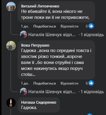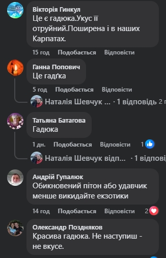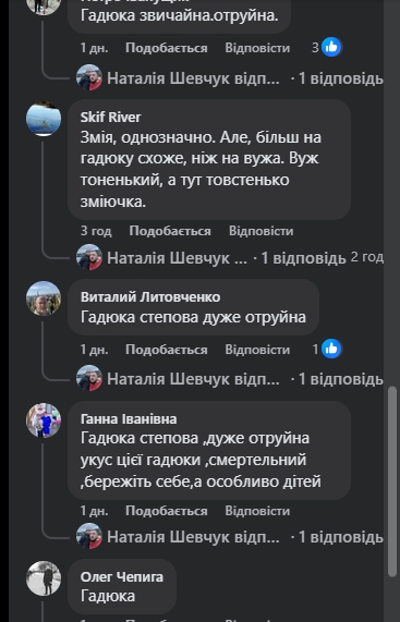 "Гадюка. Вона по середині товста і хвостик різко тонкий… Короче, вали її, бо вони отруйні і сама може накинутись якщо поруч стоїш…";