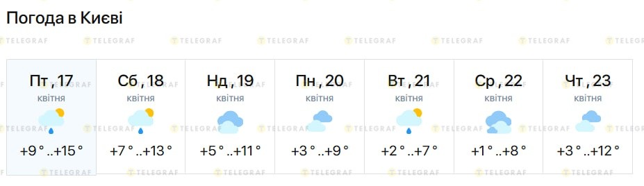 Наприкінці цього тижня, 17-19 квітня, очікується хмарність та місцями короткочасні дощі. Разом з тим температура протягом доби поступово падатиме — з +15 до +11 вдень та з +9 до +5 градусів вночі.
