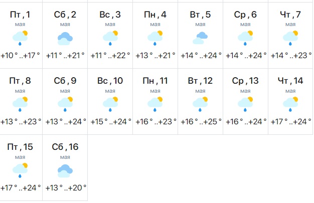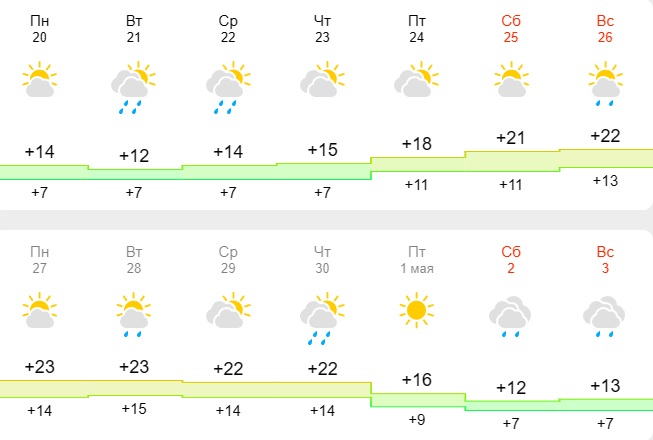 Про це свідчать прогнози погоди. Так, за даними сервісу Meteofor, з 24 до 30 квітня в обласному центрі очікується потепління. Стовпчики термометрів у ці дні можуть бути на рівні +15+23 градуси. Можливі невеликі дощі.