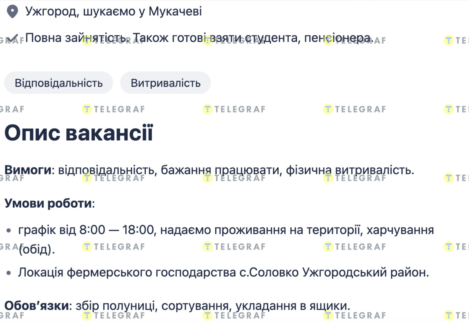 Працювати треба з 8 ранку до 18:00. При цьому людям надають проживання на території та забезпечують обідом під час зміни. Локація фермерського господарства с.Соловко Ужгородський район.