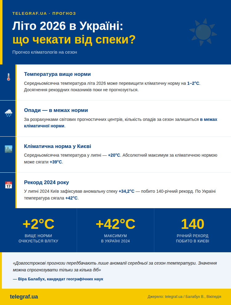 Температура повітря в Україні влітку 2026 може перевищувати кліматичну норму на кілька градусів. Однак поки що невідомо, чи досягнуть показники рекордних, як це було кілька років тому.