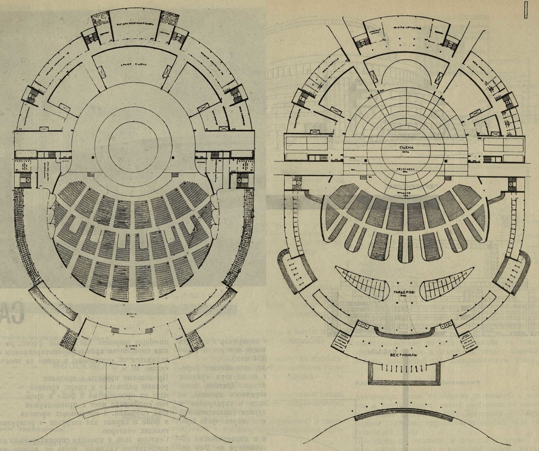 Головною особливістю театру був круглий глядацький зал на 4000 місць. Архітектори відмовилися від традиційного поділу на яруси: місця вибудовувалися єдиним амфітеатром, а при повному відкритті порталу зал і сцена сливалися в один спільний простір. Таке планування однаково підходило і для вистав, і для великих зібрань чи святкових заходів.