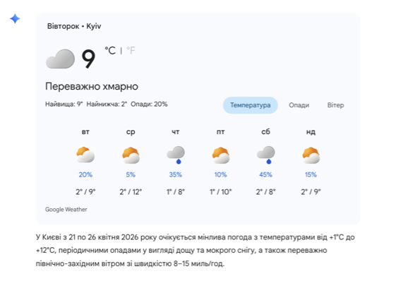 За даними розрахункової моделі WeatherNext 2, період з 21 по 26 квітня обіцяє бути по-справжньому випробувальним. Синоптичні дані вказують на те, що температура повітря у столиці суттєво коливатиметься.