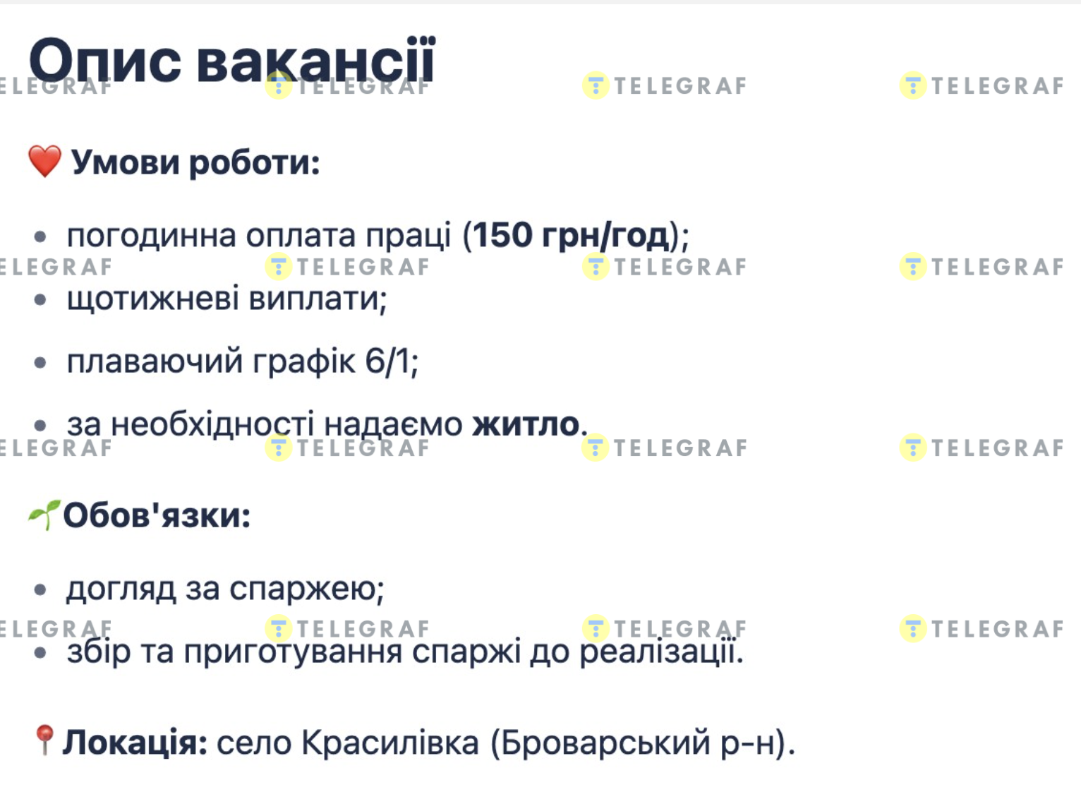 Також за потреби роботодавець може надавати житло. За місяць обіцяють зарплату 27-31 тисяча грн. Робота сезонна у селі Красилівка (Броварський р-н).