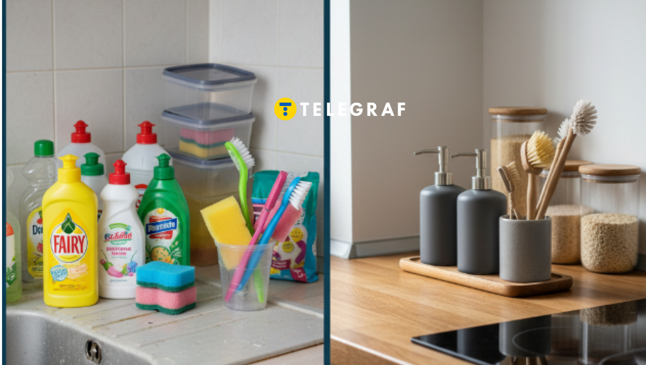 Яскраві пляшки мийних засобів, різнокольорові губки, різноманітні пластикові контейнери без єдиного стилю — у впорядкованому просторі такі речі часто замінюють на нейтральні дозатори та мінімалістичні рішення, щоб уникнути візуального перевантаження.