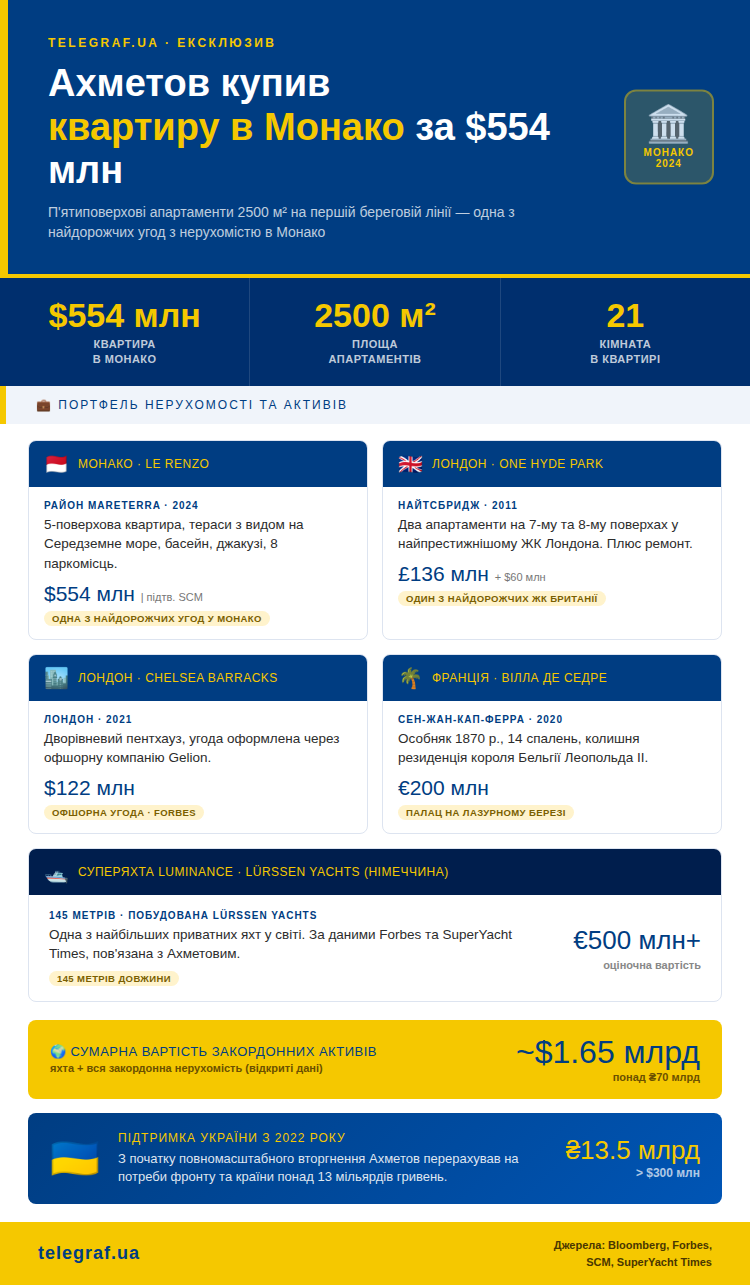 Так чи інакше, лише вищезгаданий список з яхтою та закордонною нерухомістю, включаючи нові апартаменти в Монако, якщо вірити даним із відкритих джерел, уже можна оцінити приблизно в 1.65 млрд доларів або понад 70 мільярдів гривень.