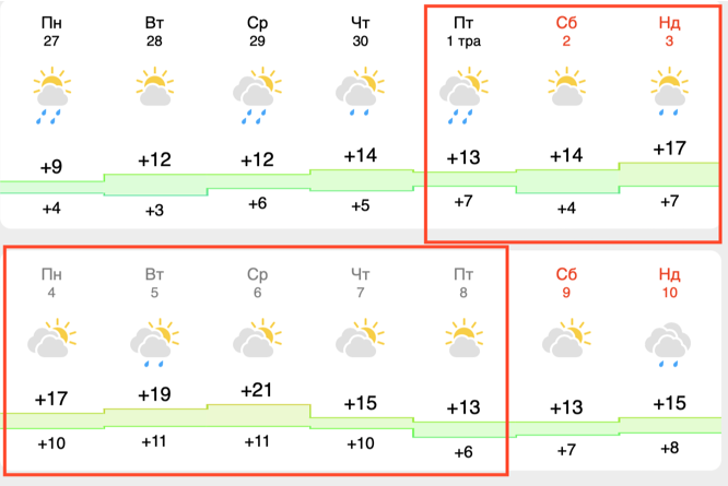 Вже 2 травня погода продовжить цю приємну тенденцію, додавши ще кілька градусів. Стовпчики термометра вночі сягнуть +10°C, а вдень +21°C.