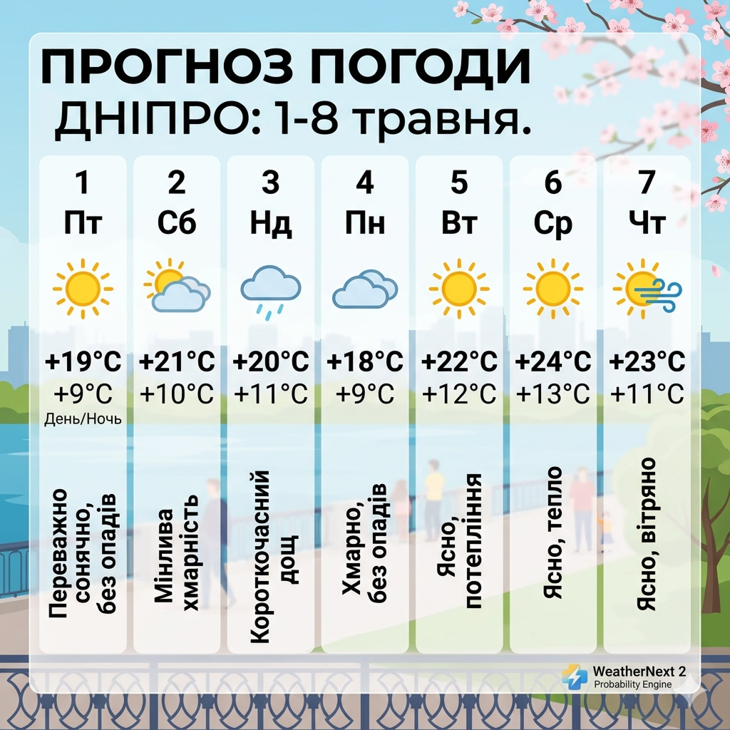 Згідно з даними прогностичної моделі WeatherNext 2, тепло прийде до міста чітко за графіком. Вже з 1 травня мешканці та гості Дніпра відчують суттєве потепління, коли стовпчики термометрів вночі триматимуться на позначці +9°C, вдень піднімуться до позначки +19°C.