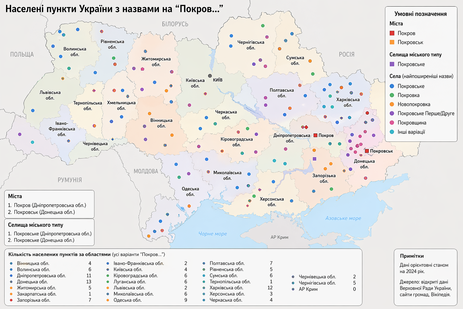 В Україні є всього два міста зі схожою назвою — Покров та Повровськ, ще кілька селищ міського типу Покровське та близько 50 сіл зі схожою назвою: Покровське, Новопроквка, Покровське Перше/Друге, Покровське-Жукове, Поровщина тощо. Зустрічаються такі назви майже в кожній області України і не один раз.