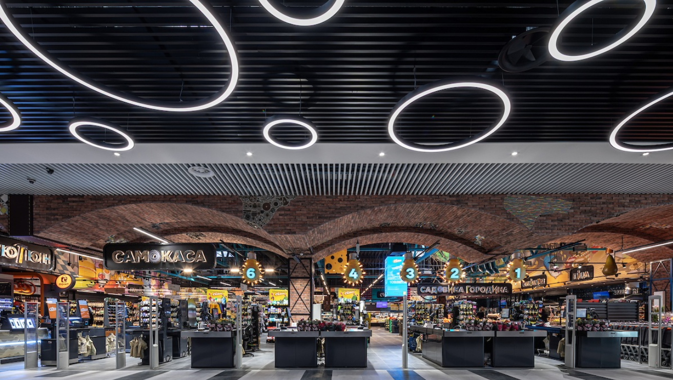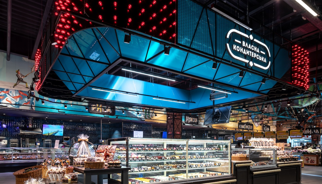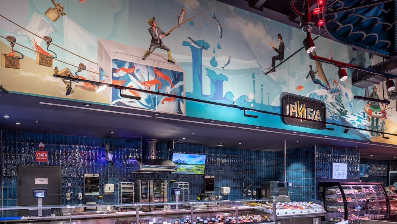 Про незвичайний магазин рітейлер розповів на своєму сайті. Торговий простір прикрашений унікальними інсталяціями та скульптурами.