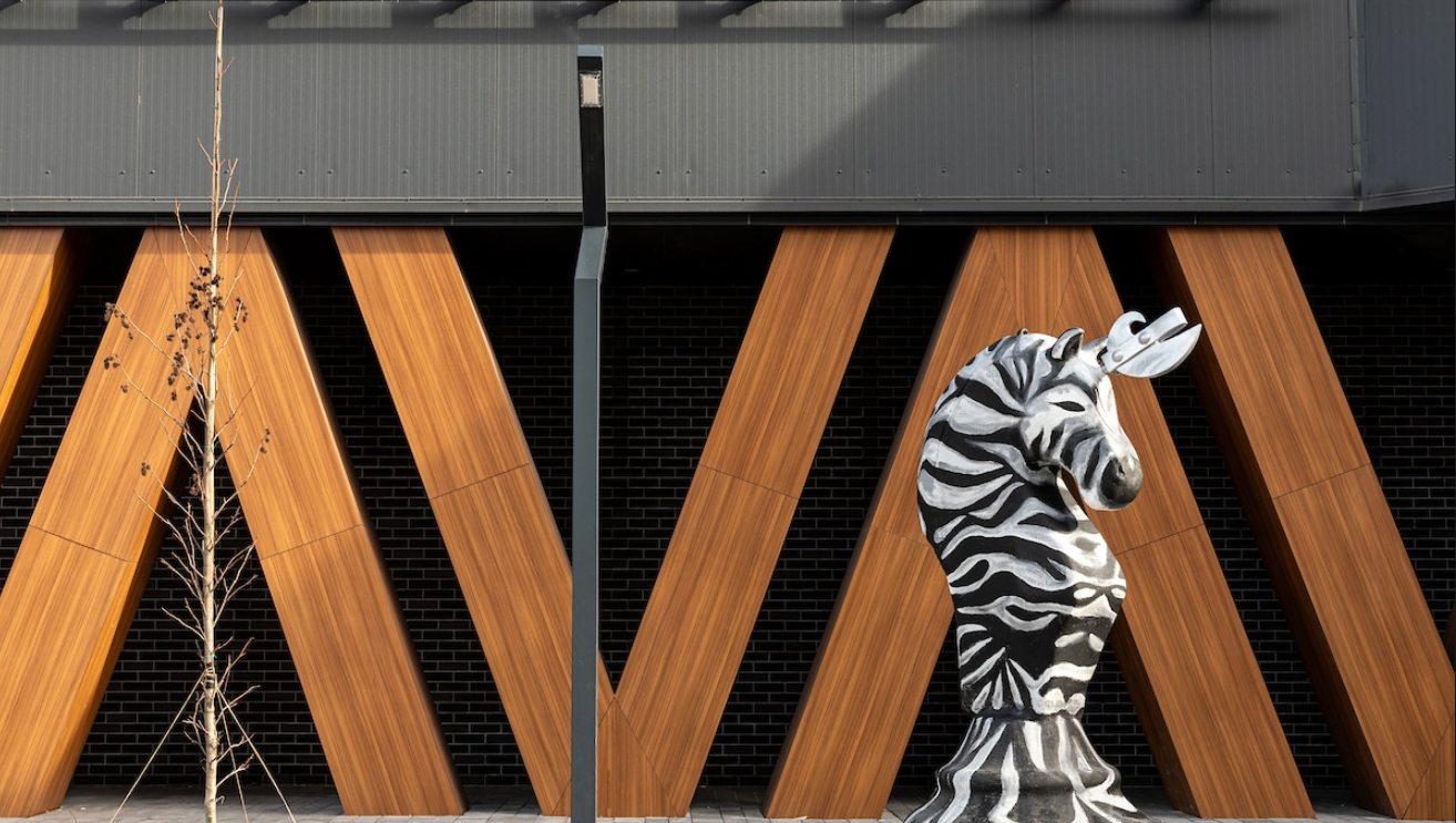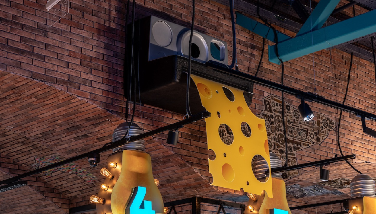 Біля входу відвідувачів зустрічає фриз із найнесподіваніших речей, який утримує роботизована рука. Серед деталей — ретрокасети, олівці та елементи LEGO, що натякають на світ винаходів та експериментів.