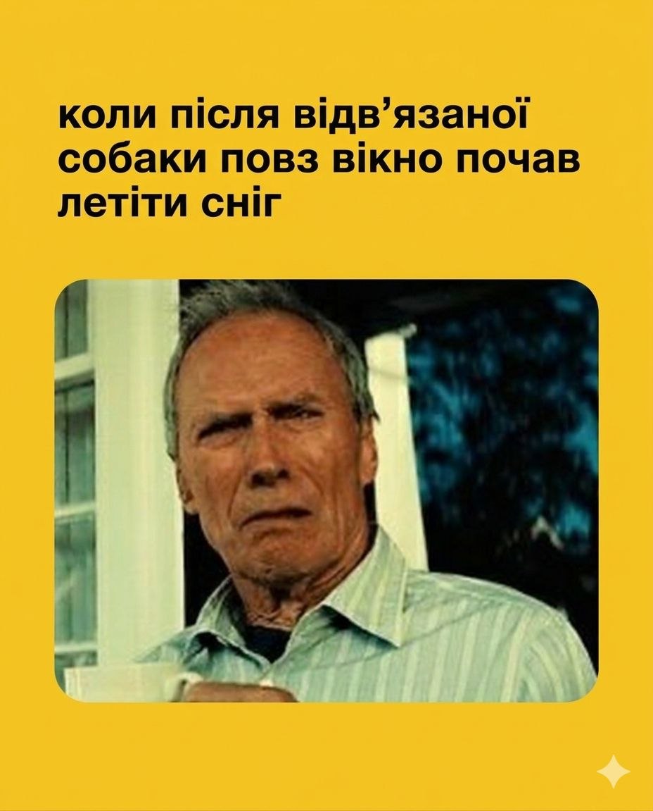 "Коли після відв'язаної собаки повз вікно почав летіти сніг", — зазначено в мемі.