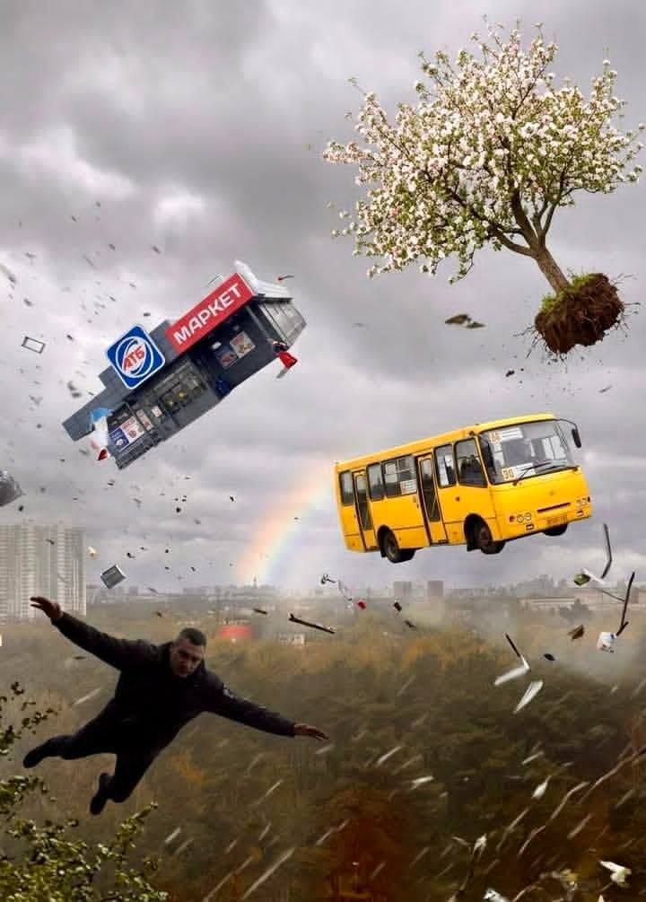 На черговому мемі зображені літаючі магазини, маршрутки, поліцейські та дерева. На картинці відображений потужний вітер, що бушував протягом дня в Україні.