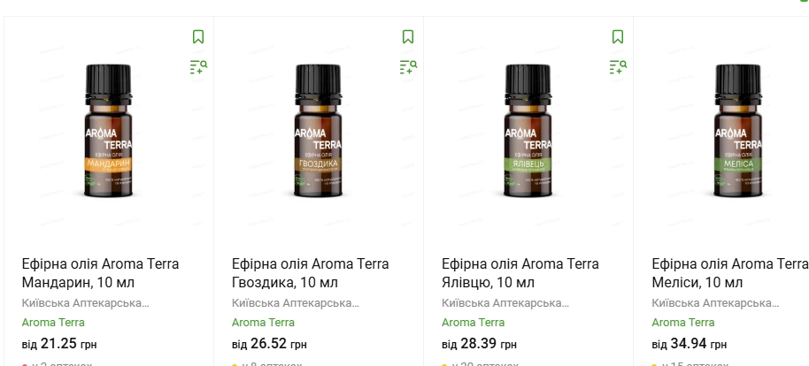В Україні можна придбати широкий асортимент ефірних олій. Ціна на найдешевші варіанти починається з 22 гривень і сягає понад 200 гривень за флакон 10 мл, залежно від бренду, виду олії та її якості.