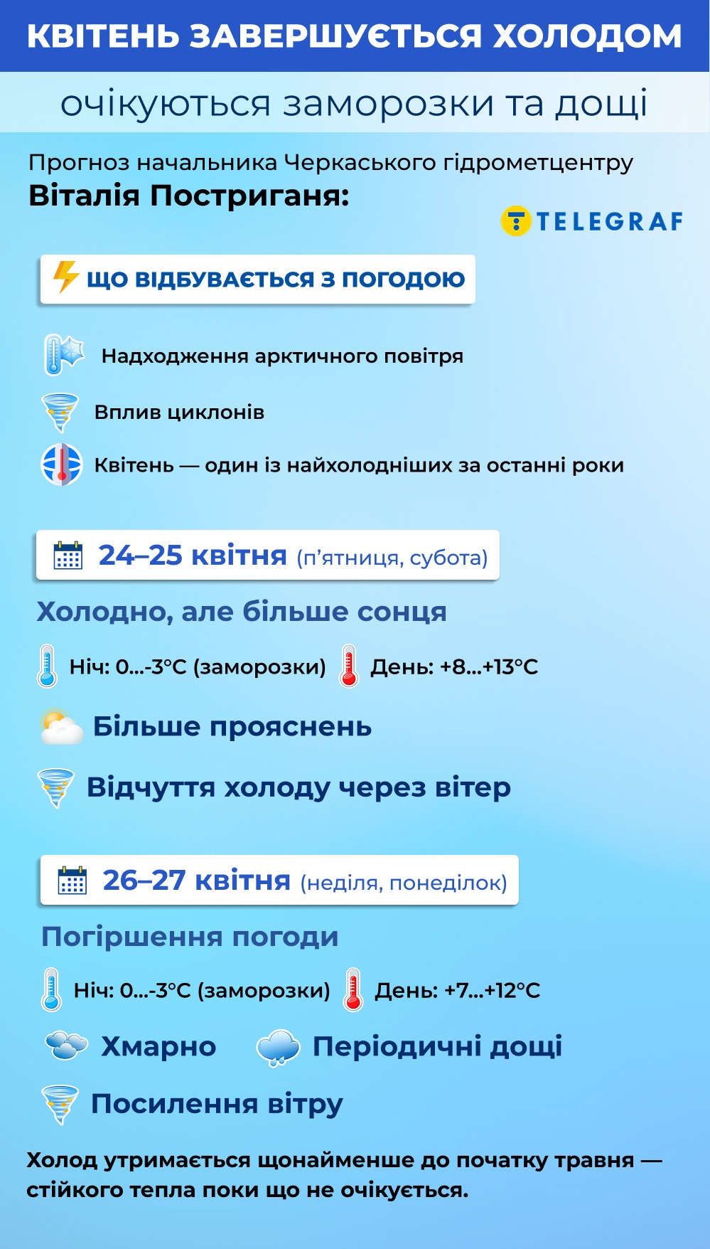 "У неділю та понеділок, 26-27 квітня, атмосфера буде динамічною — завдяки наступному північному вихору. Погода очікується холодна і нестійка: часом дощ, посилення вітру, температура вночі від 0 до -3°С, вдень лише від +7 до +12°С", — пояснив Постригань.
